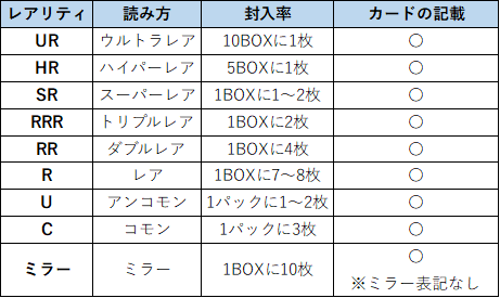 レアリティの中でも「UR」「HR」「SR」は上位レアリティとされ、カードリストに入ってないのでカードリスト上のナンバーよりも大きなナンバーが付与されています。